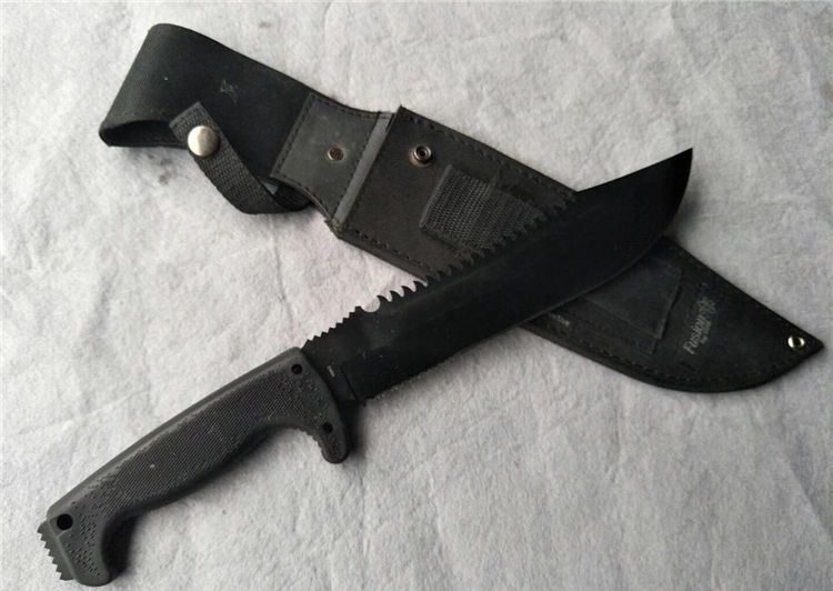 全长:39cm 刃长:24.5cm 刃宽:5cm 刃厚:0.4cm 刃材:7CR17 硬度:59HRC 表面:电脉 柄材:高级橡胶 柄长:14.5cm 净重:550克 毛重:650克(含包装物) 刀鞘:专用战术尼龙套 结构:整刀线切割而成,刀柄在成刀后连刀铸出,异常结实