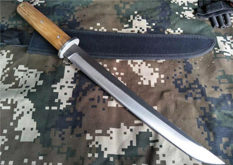 全 长: 42cm 刃 长: 29cm 柄 长:12.7cm 刃 厚: 5mm 刃 材: 不锈钢 硬 度: 58HRC 重 量: 0.85kg 表 面: 氧化黑 柄 材: 坚木 刀 鞘: 尼龙 工 艺: 手工锻炼