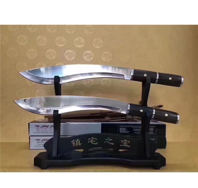 刀奴2—太阳神弯刀( 镜光) 全 长:510mm 刃 长:325mm 柄 长:163mm 刃 宽:60mm 刃 厚:5.3mm 刃 材:5Cr13Mov 重 量:960g(含包装) 硬 度:57HRC 表 面:镜光 柄 材:钢+黑檀木 锁 型:定锁 其 他:配皮套