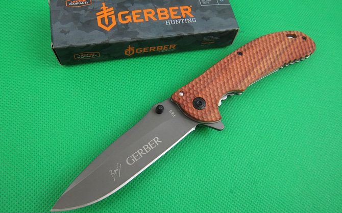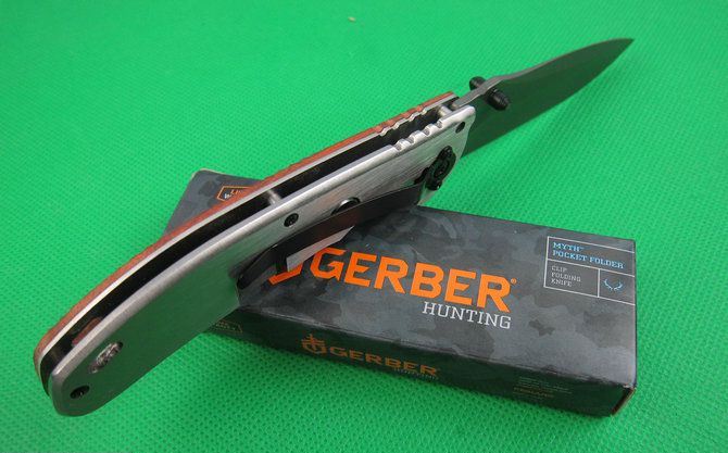 戈博F63快开折刀 全 长:22cm 刃 长:10cm 刃 宽:2.7cm(最宽处) 刃 厚:2.9mm 柄 长:12.8cm 表 面: 镀钛 刃 材: 5CR13MOV 硬 度: 57HRC 柄 材: 实木+拉丝钢片 重 量:170克(含彩盒子), 锁 闭:快开 备 注:带腰夹