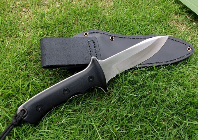 全长:278(5寸) 刃长:140(5寸) 柄长:138 刃厚:5.6 刃材:A2 硬度:59-60HRC 表面:钢本色 柄材:G10 刀鞘:牛皮 磨法:凹磨