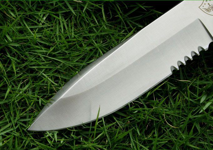 鹰版新款绿扁帽战术直刀(5寸半齿版) 全长:278(5寸) 刃长:140(5寸) 柄长:138 刃厚:5.6 刃材:A2 硬度:59-60HRC 表面:钢本色 柄材:G10 刀鞘:牛皮 磨法:凹磨