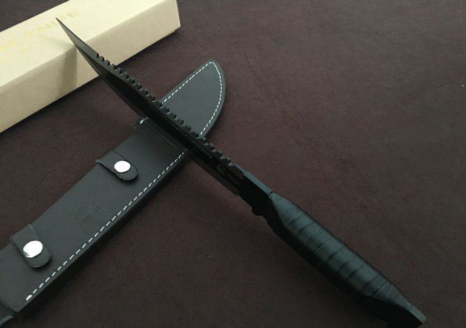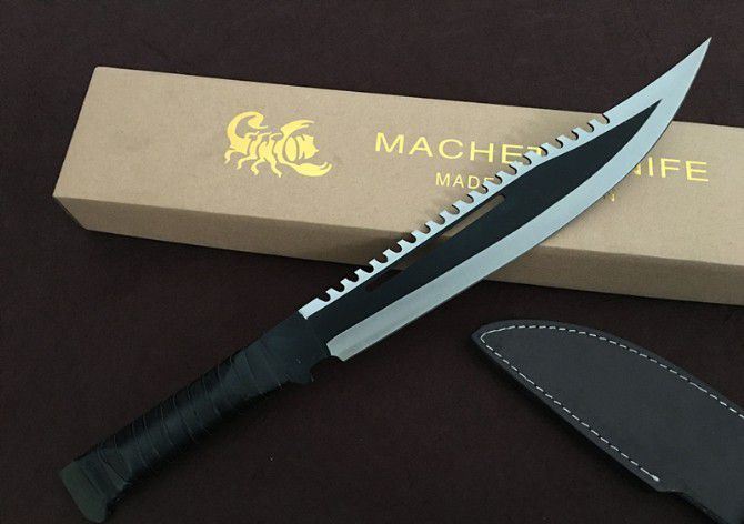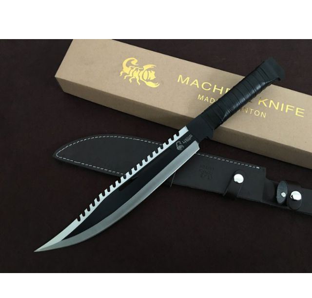 蝎子丛林开山刀(黑色) 全 长:460mm 刃 长:290mm 柄 长:145mm 刃 宽:50mm 刃 厚:6mm 刃 材:5Cr13Mvo 重 量:990g(含包装) 硬 度:57HRC 表 面:氧化黑 柄 材:扎皮 锁 型:定锁 其 他:配皮套+纸盒