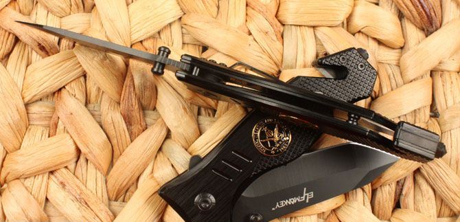 全长:20.5cm 刃长:8.7cm 刃宽:2.5cm 闭合:12cm 刃厚:0.28cm 钢材:440C 硬度:56HRC 净重:145g 表面:氧化黑 柄材:金属铝 锁型:线锁 包装:彩纸盒