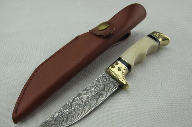 全 长:19cm 刃 长:9.0cm 柄 长:9.7cm 刃 厚:3.0mm 刃 材:大马士革钢 硬 度:58HRC 刀 柄:骆驼骨/雕花双铜头 表 面:大马士革花纹 重 量:280.0克(包括皮套) 备 注:带皮套