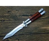 蝴蝶红木蝴蝶甩刀 全长:22.5cm 刃长:10cm 柄长:12.5cm 刃宽: 1.9cm 刃厚:0.26cm 刃材:5Cr13MoV 柄材:彩木+钢头 硬度:56HRC 重量:140克 表面处理:砂光