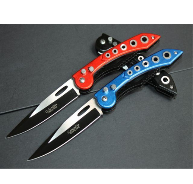 强力横开822弹簧刀(红、黑、蓝) 全长:22cm 刃长:9cm 柄长:12cm 刃厚:2mm 重量:100克 表面处理:发黑 锁型:横开弹簧刀