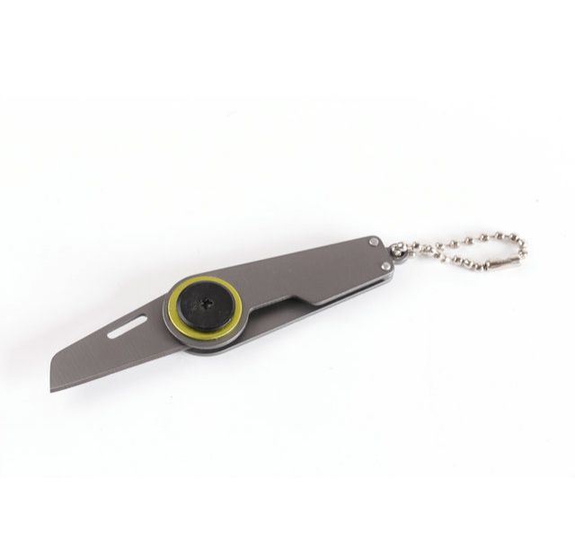 金纽扣钥匙刀 全 长:86mm 刃 长:35mm 柄 长:52mm 刃 宽:14mm 刃 厚:1.2mm 刃 材:CR13MOV 重 量:5g(含包装) 硬 度:58HRC 表 面:灰钛 柄 材:钢片 锁 型:无锁 其 他:白盒,可以扣在钥匙上