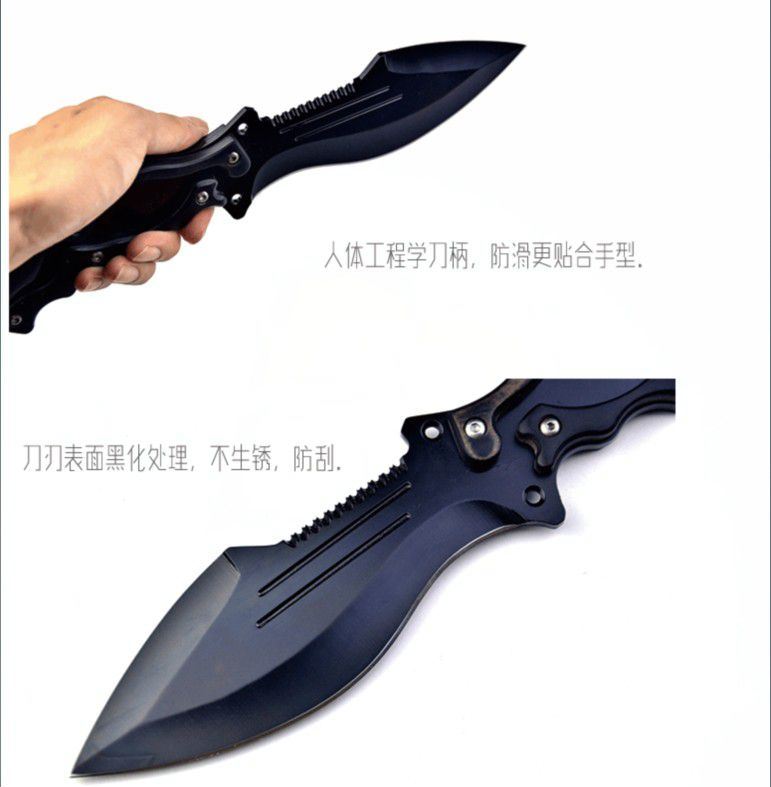 黑飓风小砍刀 全长:28cm 刃长:14.5cm 柄长:13.5cm 柄材:黑檀木 净重:250g 刃厚:4mm 刃材:440 硬度:57Hrc 表面:黑氧化 刀套:牛津刀套