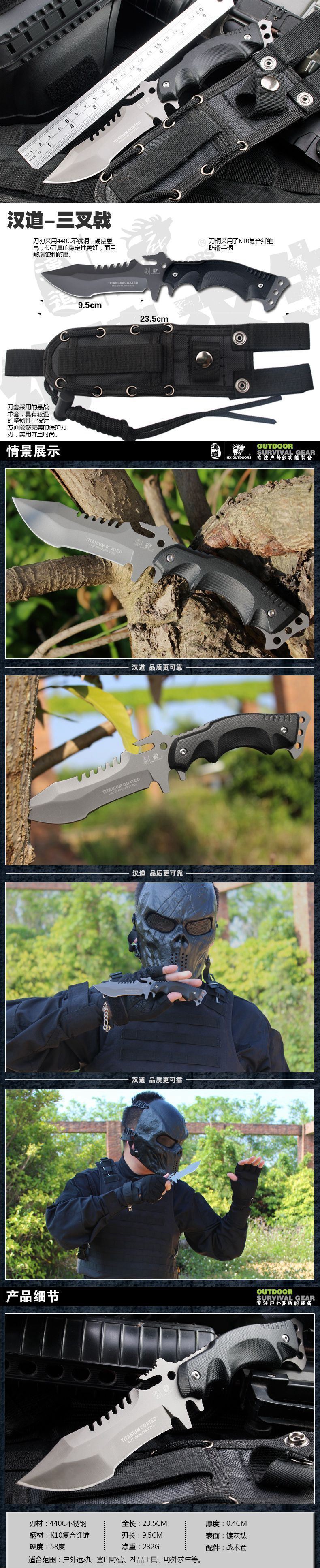 汉道三叉戟战术刀 全 长:23.5CM 刃 长:9.5CM 刃 厚:0.4CM 表 面:镀灰钛 刃 材:440C不锈钢 手 柄:K10复合纤维防滑手柄 硬 度:58HRC 重 量:232g 配 件:战术套