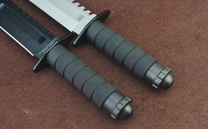 新款D80军刀(黑、白) 全长:32.5cm 刃长:18.5cm 柄长:12.5cm 刃厚:4.2mm 刃宽:4cm 刃材:3CR13钢 表面处理:电泳黑/喷灰砂 柄材:ABS塑料 硬度:56 重量:433克(含包装) 包装:尼龙套 备注:手柄内带超强玻璃锥