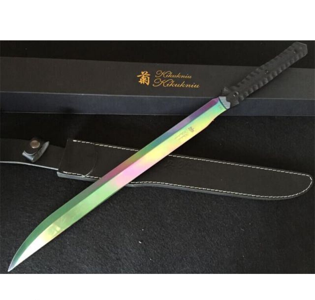 菊男彩虹版长刀 全 长:680mm 刃 长:450mm 柄 长:223mm 刃 宽:37mm 刃 厚:5.5mm 刃 材:5Cr13Wov 重 量:1320g(含包装) 硬 度:59HRC 表 面:镀彩钛 柄 材:G10 锁 型:定锁 其 他:配皮套