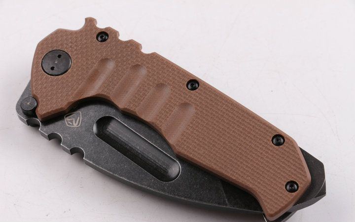 装甲部队折刀(褐色柄) 全长:22CM 刃长:9CM 刃厚:0.44CM 刃宽:4.6MM (最宽处) 柄长:13CM 刃材:440 硬度:57 刃面:石洗 柄材:石洗钢柄+G10 重量:270克 锁定:一体线锁 其他:带腰夹
