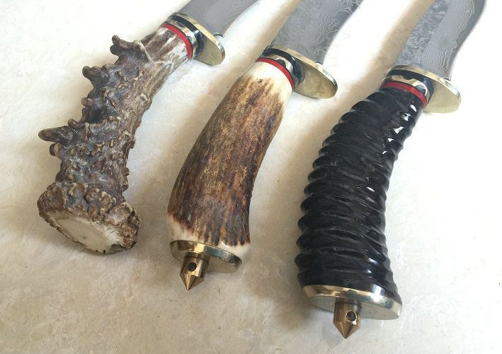 特价经典大马士革收藏猎刀 全 长: 21.5cm 刃 长: 9.8cm 刃 宽: 2.4cm(最宽处) 硬 度: 58-60HRC 刃 厚: 0.2cm 柄 材:天然鹿角或天然羊角 重 量: 200克(含包装) 刃 材: 大马士革钢 表 面: 大马士革钢特有的花纹原色 其 他: 刃口锋利,真皮套