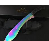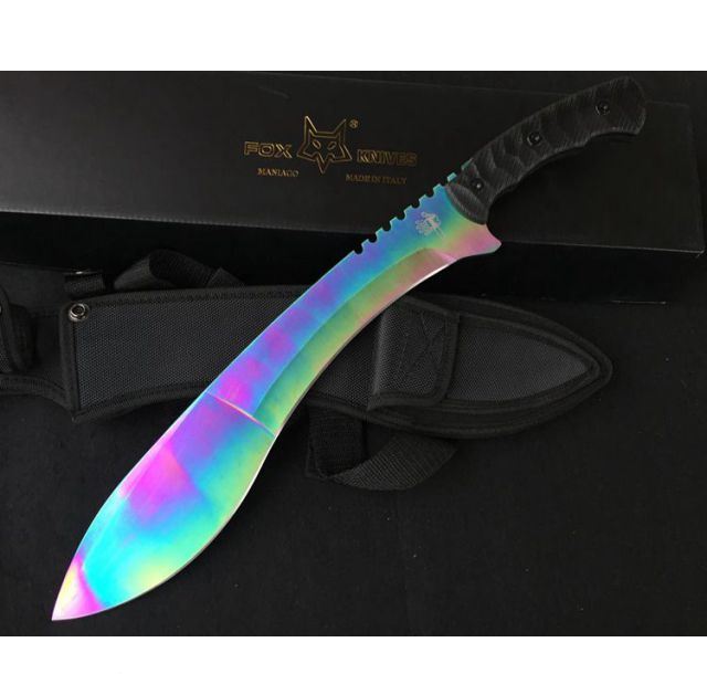 狐狸狗腿彩虹色黑柄加长版 全 长:50cm 刃 长:46cm 刃 宽:7cm(最宽处) 刃 厚:6.2mm 柄 长:13cm 表 面: 高温镀色 刃 材: 5Cr15 硬 度: 58HRC 柄 材: G10防滑柄片 结 构:龙骨一体贯穿整体