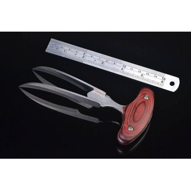 二狼爪 全长:15.5cm 刃长:7.5cm 刃厚:0.22cm 刃材:高级不锈钢 柄材:彩木 重量:143(含包装) 包装:尼龙套、彩盒 这是一款穿透力很强的手刺型防身爪子,配有尼龙刀套,可以挂在腰带上。 双刀刃都已经开锋,令敌手望而生畏