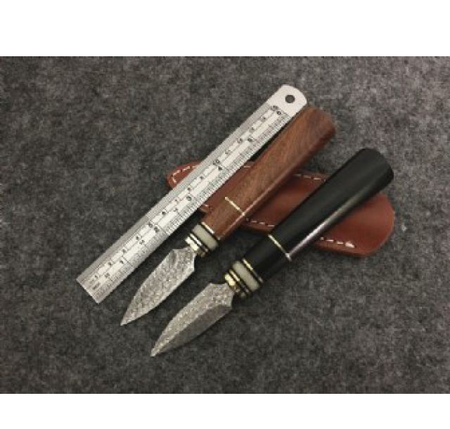 大马士革翠珍茶叶刀 全 长:15cm 刃 长:4.7cm 柄 长:10.3cm 刃 宽:1.5cm 刃 厚:1mm 刃 材:大马士革 重 量:100g(含包装) 硬 度:58HRC 表 面:大马士革原色 柄 材:铜头+兽骨+檀木