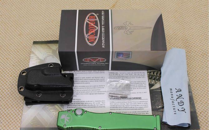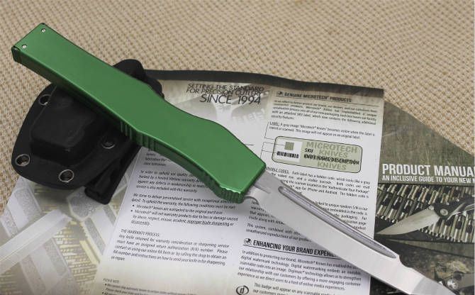 精仿微技术150-10超弹力直跳刀绿柄 全 长:27.4 CM 刃 材:D2钢 刃 长:10.6 CM 刃 宽:1.98 CM 刃 厚:0.43 CM 柄 材:铝合金 刀 型:直跳 锁 型:按钮锁 重 量:148.8克 附 件:Kydex鞘,说明书,彩盒 整刀用,CNC,电脑锣,线切割制作而成,手工,精密度非常高