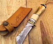大马士革战车猎手收藏刀 全长:23.5cm 刃长:11cm 厚度:3.6mm 柄长:12.5cm 硬度:59-60HRC 钢材采用:锻打大马士革钢、刀刃背部15段齿牙打磨而成 手柄材料做工:护手采用纯黄铜+白铜刻花+天然牛骨+隔片G10、尾部白钢可穿皮绳等,整刀做工细腻,特配手工版高档牛皮刀套