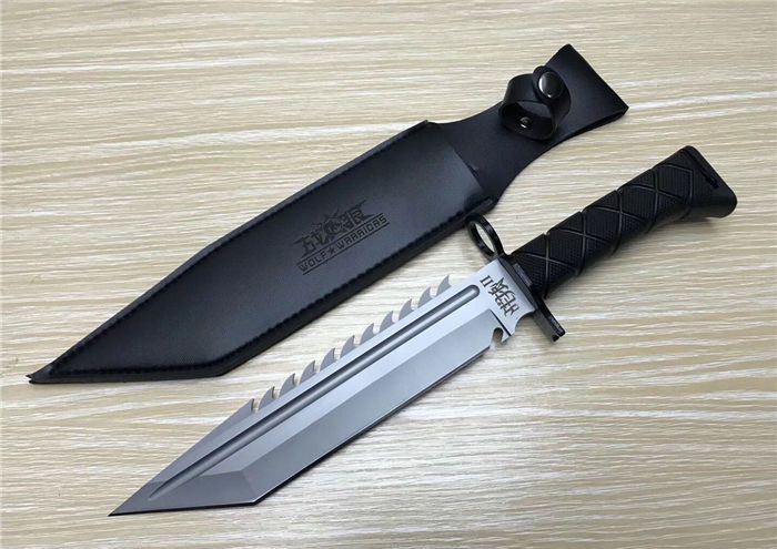 平头战狼军用刀皮套 全 长:36.7CM 刃 长:24.0CM 柄 长:12.6CM 身 最大宽度:4.5CM 刀 厚:0.55CM 刃 面:喷砂 毛 重:700克 钢 材:5CR13钢 硬 度:57 刀 柄:绝缘强化塑胶 刀 鞘:仿真刀套+彩盒
