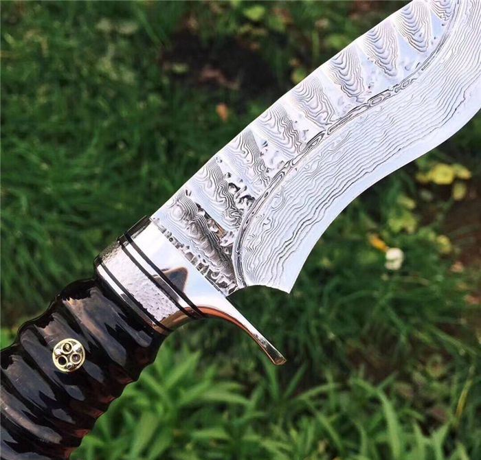 继任者大马士革高端手工猎刀 全长:22cm 刃长:11cm 柄长:11cm 刃厚度:4MM 刃材:进口大马士革钢 硬度:60HRC 手柄材料:天然无暇黑羊角 配置:头层手工皮套+礼盒包装