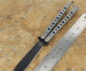 蝴蝶钛柄BM51-V3黑刃甩刀 全长:23.75CM(打开) 刃长:10.78CM 刃厚:0.254CM 刃材料:D2工具钢 刀柄:全钛柄 硬度:58 刀鞘:尼龙刀鞘 由The one (唯一)精工打造,刀柄选用一体T-4钛经数控车床(CNC)加工而成,刀刃选用优质440C刀刃,数控精磨,搭配高品质丝扣等,精工细活,为广大甩刀迷打造经典蝴蝶甩刀