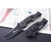 刃材:440 硬度: 56 类型: 折刀 全长:20.2CM 刃长:8.5CM 刃厚: 0.32CM 刃宽:3.6CM (最宽处) 柄长: 11.7CM 柄厚: 1.5CM 涂层:发黑 柄材: G10片+钢垫 重量:180克 锁定翰嗨?开锁按钮设在刀把侧面 带腰夹