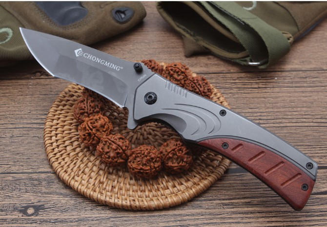 创名CM86快开折刀 全长:21.4cm 刃长:9.5cm 柄长:12.1cm 刃宽:2.9cm 刃厚:3.0mm 刃材:440 重量:219(含包装) 硬度:57HRC 表面:灰钛, 柄材:钢片+酸枝木 锁型:线锁 其他:配厂盒