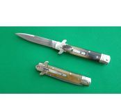 全 长:19.5mm 刃 长:7.6mm 柄 长:13cm 刃 宽:1.35cm(最宽处) 刃 厚:2.6mm 刃 材:D2 硬 度:59-60 刀 柄:天然花牛角 开刀方式:弹簧 重 量:120克 包 装:木盒 意大利黑手党使用的经典刀具-赌徒跳刀,在电影"教父"里出尽了风头!枪刺刃的黑手党侧跳,弹力超强,锁定到位,不会两边摆动现象,采用D2钢和天然鹿角柄线切角加工而成,带有保险装置,刀护手处暗藏闭合开关,出口产品,质量保证!满足把玩和收藏需要.